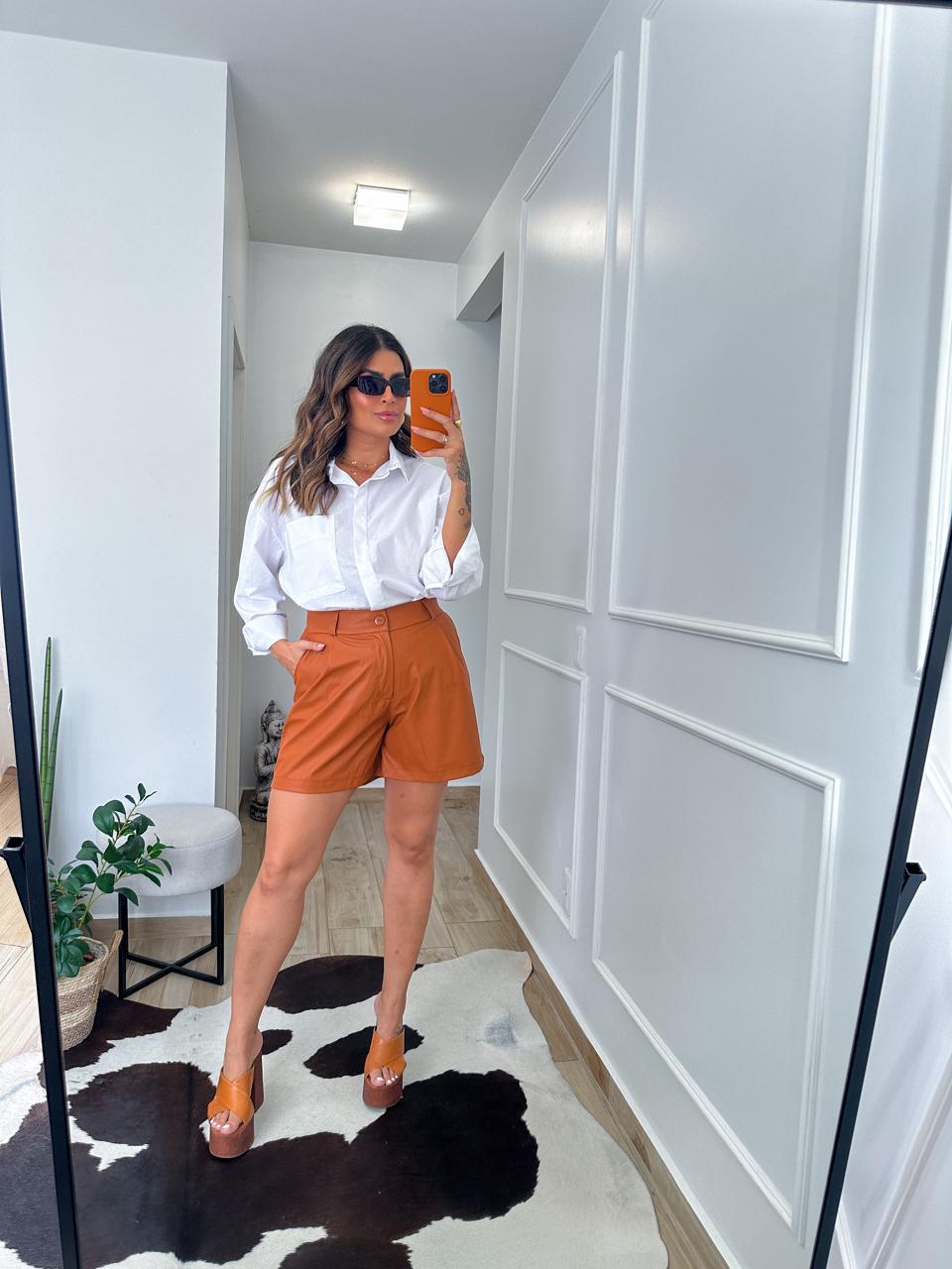 Modelagem: Bermuda em PU, fechamento de botão e zíper, e bolso faca.