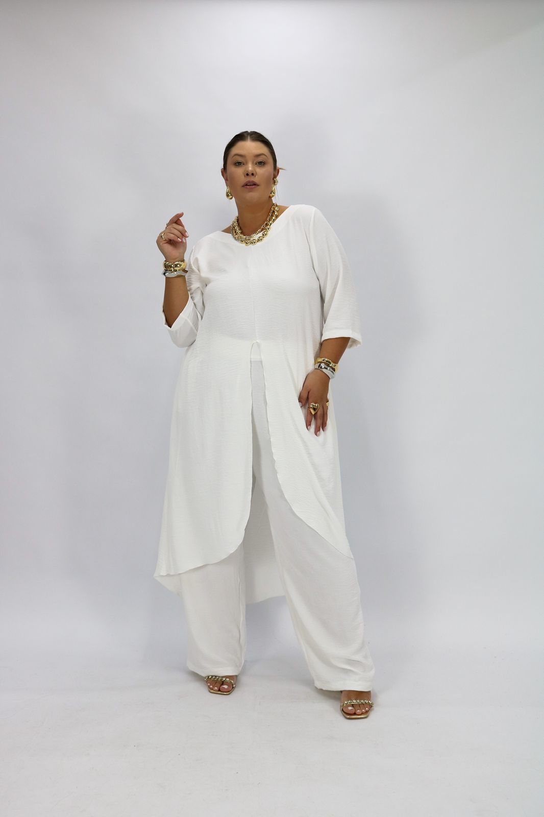 Modelagem: Camisa, fenda, manga 3/4, gola em U.