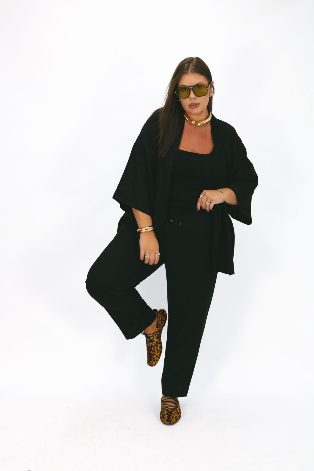 • Combine com o Kimono Lais para um conjunto harmonioso e autoral, com blusa e sandália de salto para um look sofisticado, ou com t-shirt e tênis para um visual casual e moderno. Perfeita também para viagens pela leveza e facilidade de conservação do tecido.