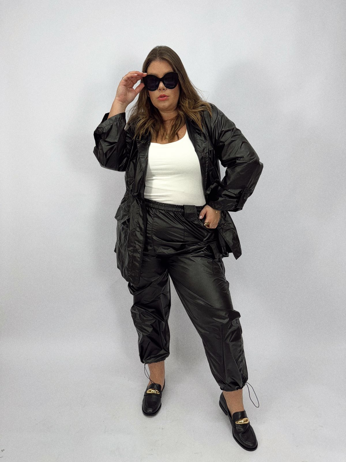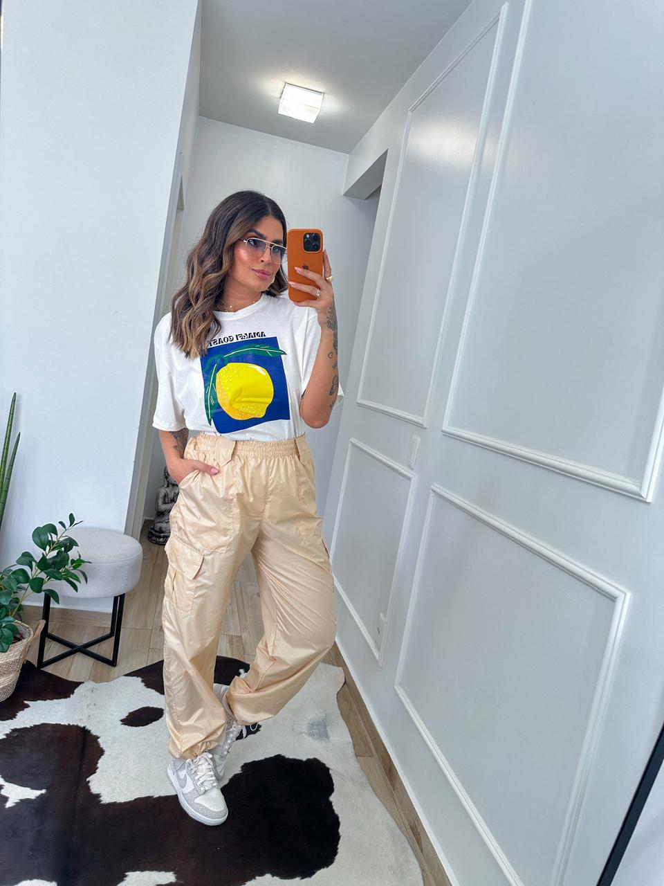Modelagem: Calça cargo, elástico na cintura, regulagem no tornozelo.