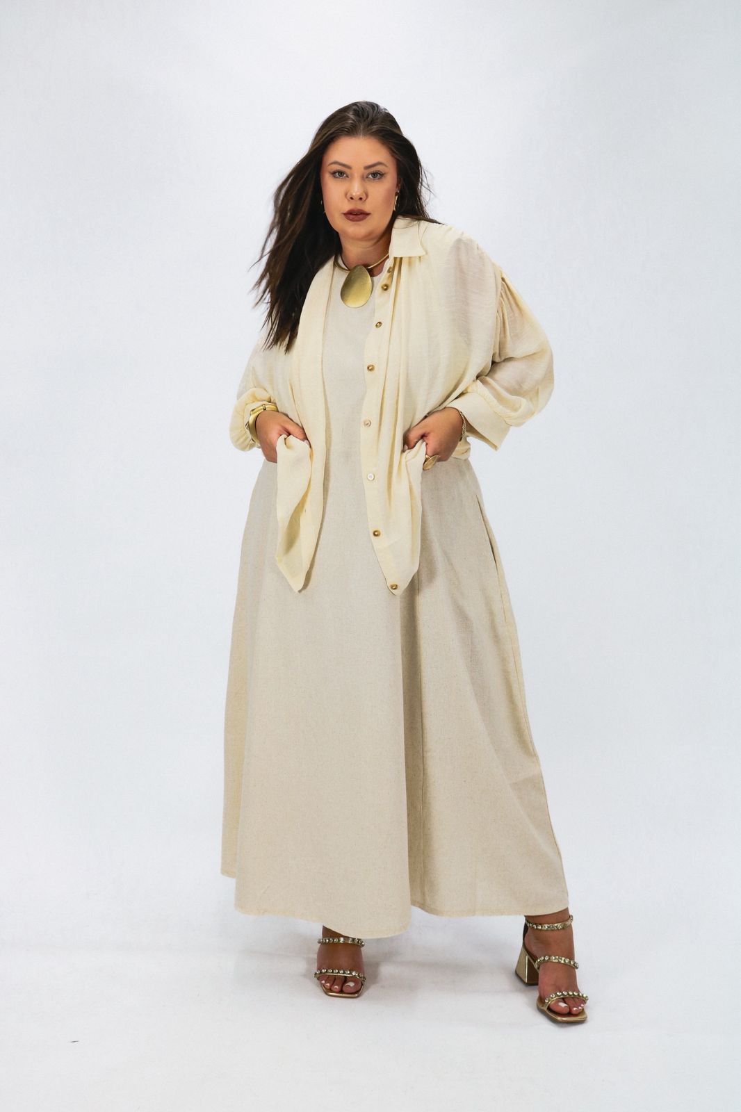 Modelagem: O detalhe principal que transforma o look é a manga 3/4 bufante. O volume sutil nos ombros confere feminilidade e está super em alta! A gola clássica mantém a estrutura e a versatilidade da camisa tradicional. Fechamento frontal por botões discretos que garantem um acabamento refinado e prático.