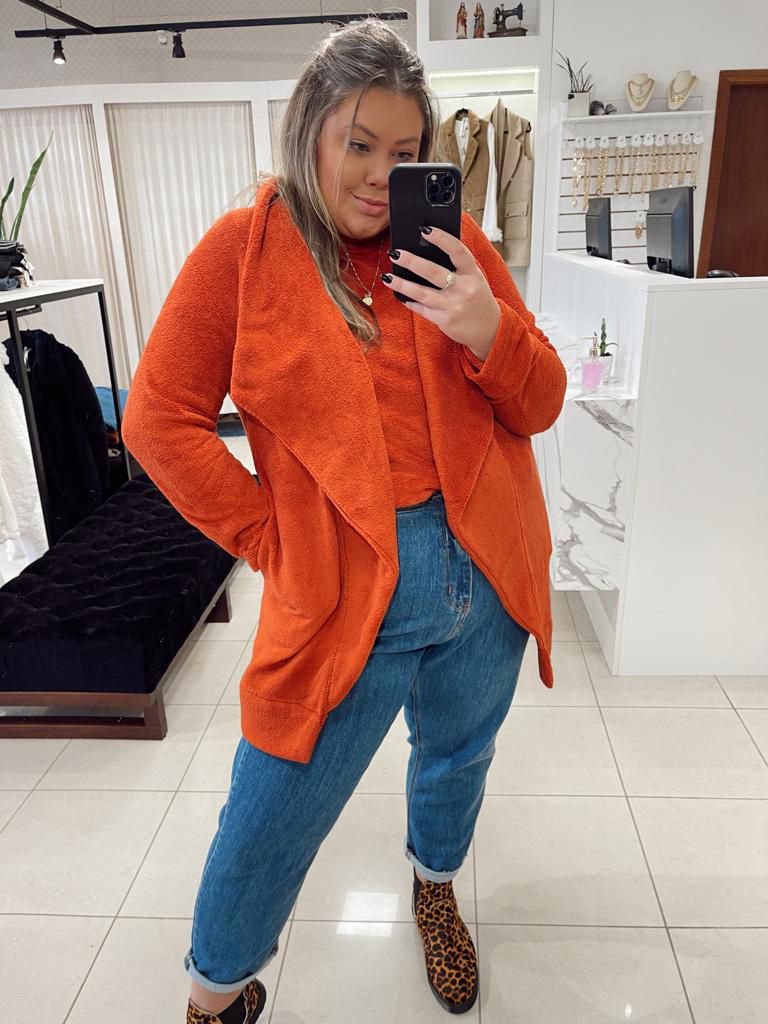Modelagem: Casaco de fleece com bolso nas laterais.