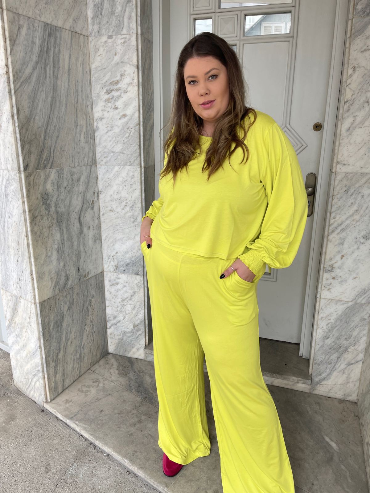 Modelagem: Pantalona de viscolycra com elástico na cintura e bolso faca.