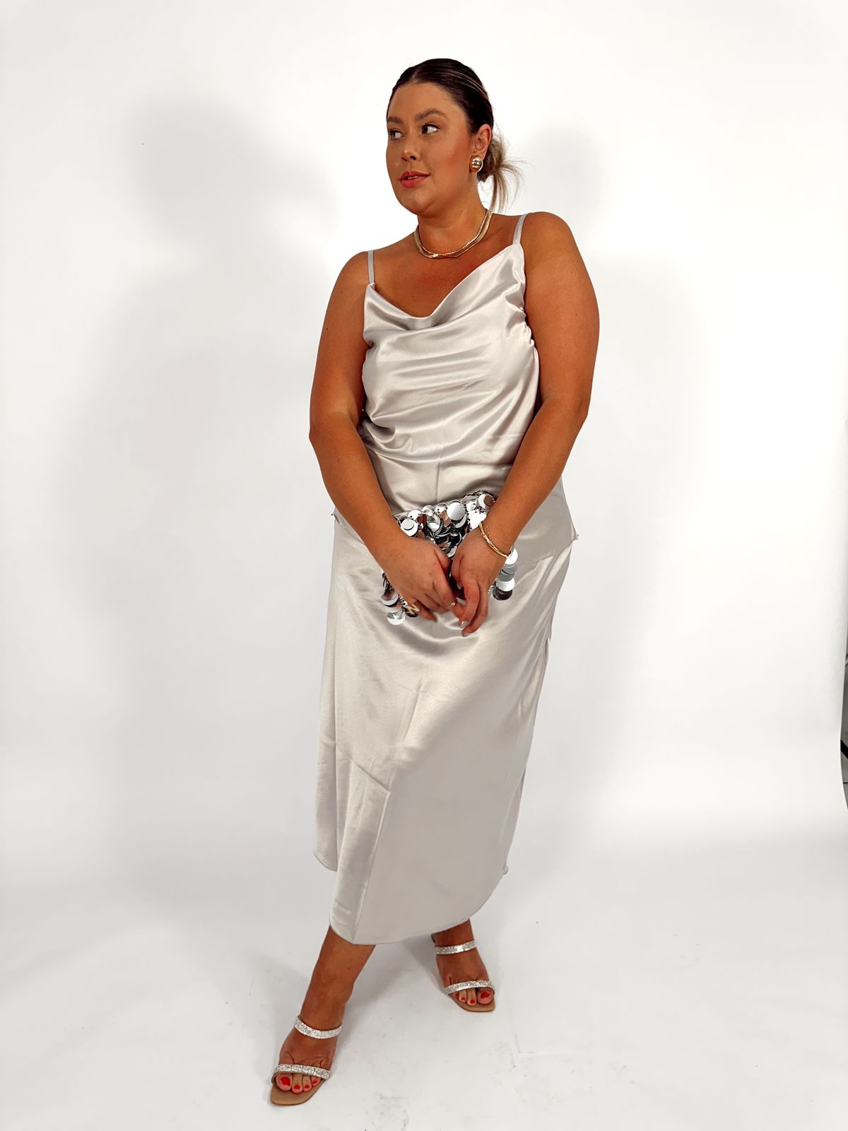 Modelagem: Regata mais comprida,de cetim, com elástico nas costas e regulagem nas alças.