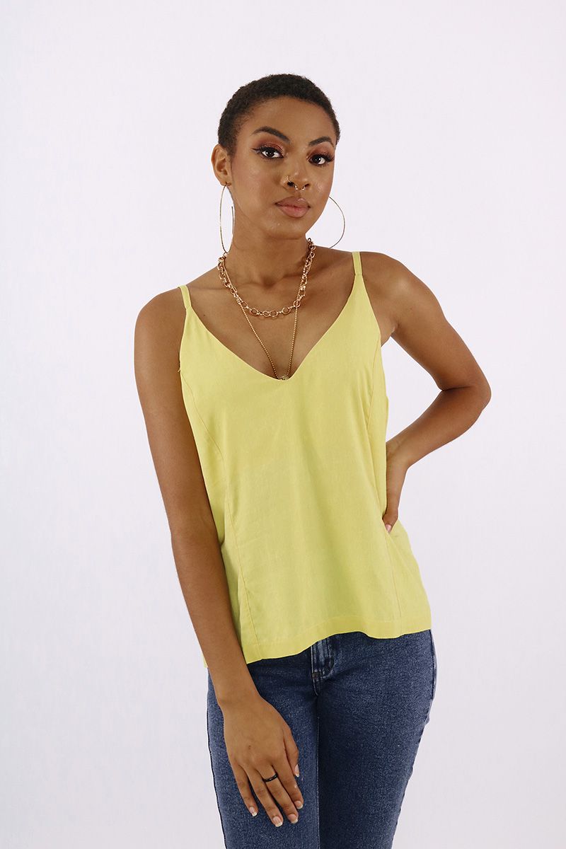 Modelagem: Reta com alças finas e decote V com forro no busto.
