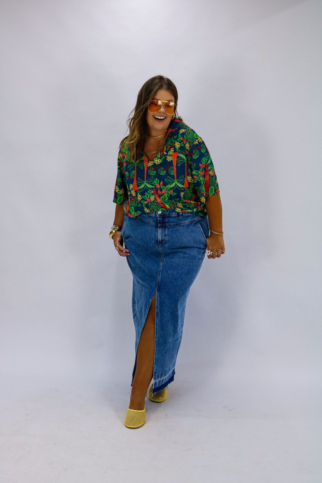 Modelagem: Saia jeans, com fenda fronta, fechamento de zíper e botão e bainha estonada.