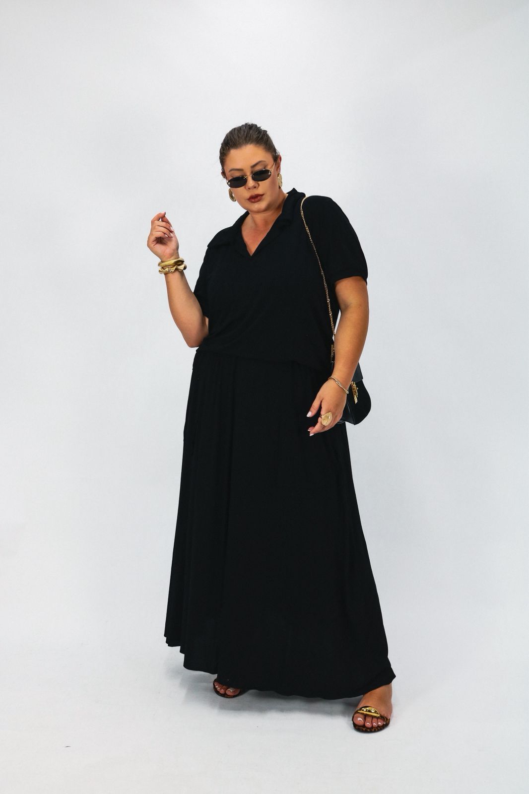 Modelagem: Uma saia oversized para quem ama estilo com personalidade! Com recorte trapézio que cria um volume moderno e cheio de fluidez, ela ainda traz bolsos aplicados nas laterais, detalhe que une charme, praticidade e aquele toque de autenticidade que faz toda diferença.