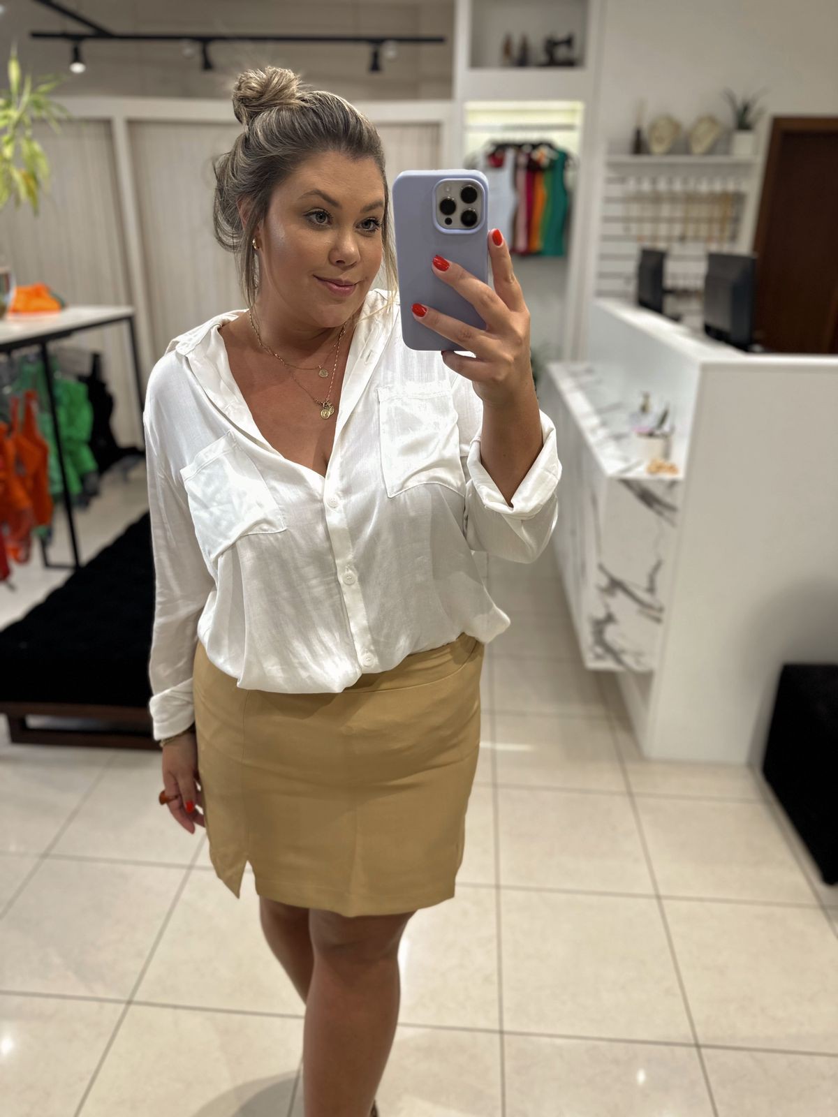 Modelagem: Mini saia com detalhe de elástico na parte de trás e com fenda na frente.
