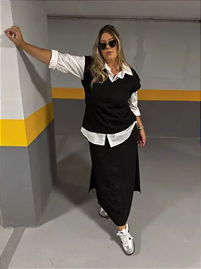 Modelagem: Saia longa, com cos de alfaiataria e elástico na parte de trás , fenda lateral e bolso faca.