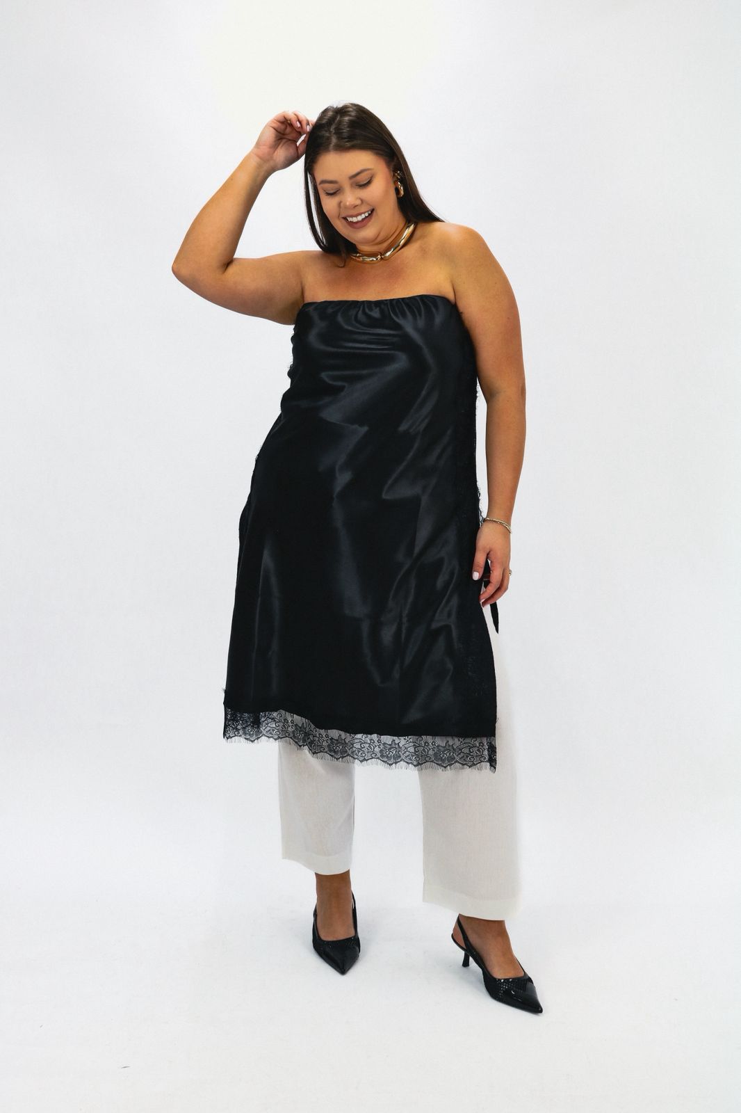 Modelagem:Tomara que caia alongado em cetim, com toque acetinado e caimento fluido que valoriza o visual com elegância. O modelo conta com elástico no busto para melhor sustentação e conforto, além de fendas laterais que adicionam leveza e movimento. Os detalhes em renda trazem um toque delicado e feminino, tornando a peça perfeita para compor looks sofisticados e cheios de charme.