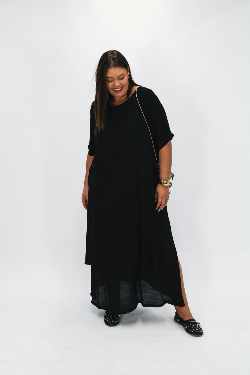 Modelagem: Vestido longo com modelagem dupla e mangas curtas, confeccionado em tecido leve e confortável. Possui decote redondo, fechamento por botão na nuca e uma capa sobreposta com amaração nas laterais, que adiciona charme e movimento ao visual. Uma peça elegante e moderna, perfeita para diversas ocasiões.