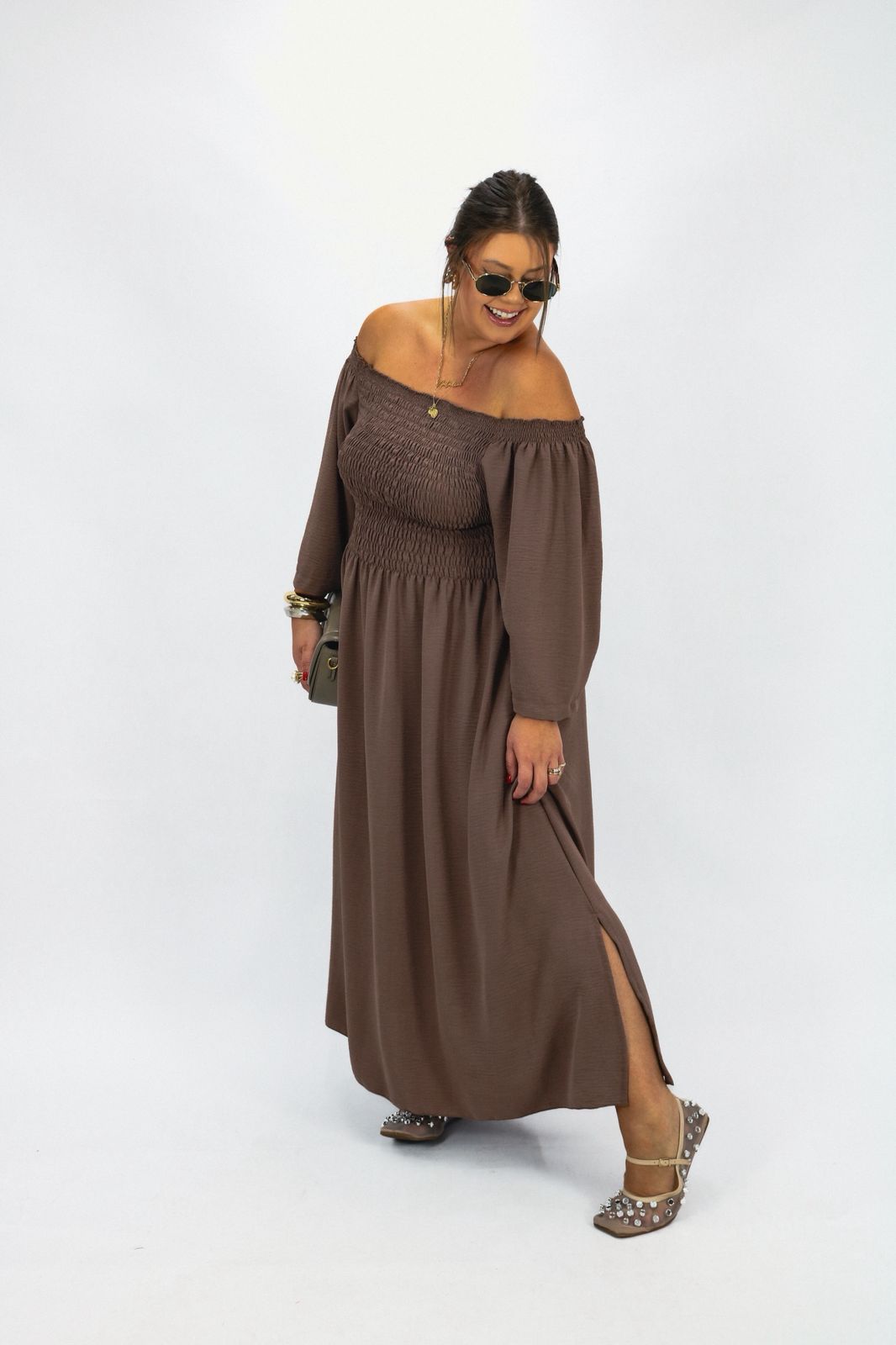 Modelagem: Vestido longuete em air flow, possui caimento fluido e toque agrádavel. O lastex no busto valoriza a silhueta e garante conforto, enquanto a manga 3/4 franzida e a saia com franzidos delicados adicionam sofisticação e movimento. Conta ainda com bolsos laterais funcionais e fenda na lateral, que adicionam praticidade e movimento ao look.