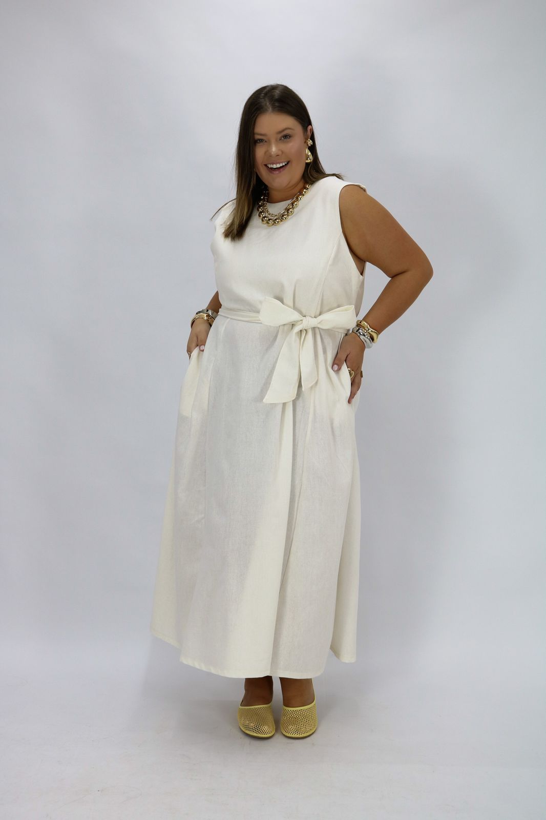 Modelagem: Vestido longo de linho, regata, bolsos laterais, fechamento de ziper na parte de trás e faixa para a cinturar.