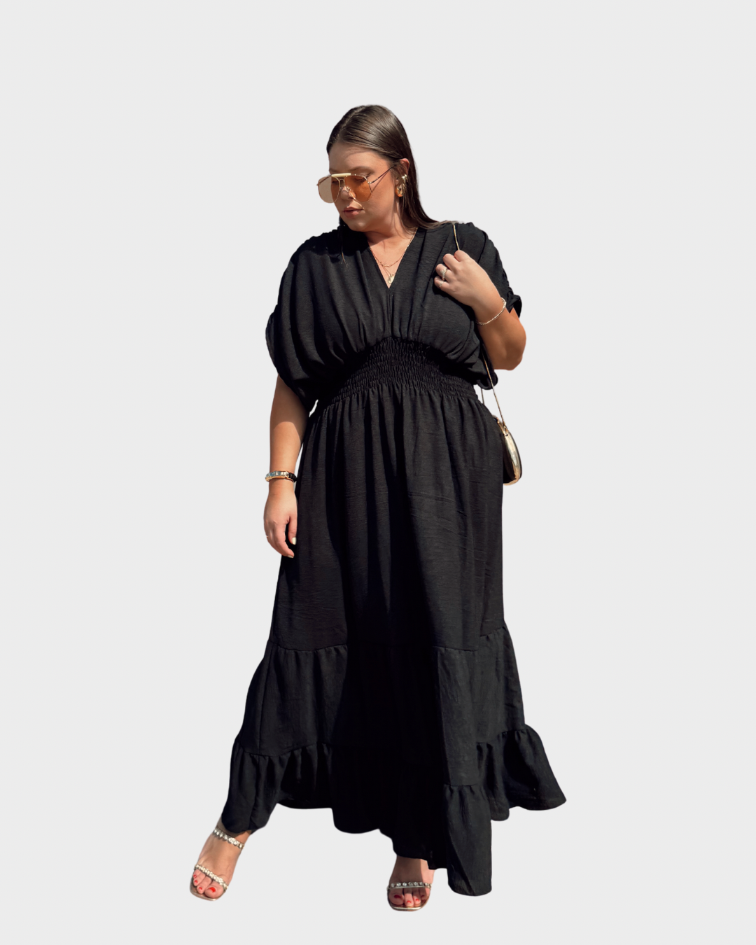 Modelagem: Vestido longuete em air flow, com modelagem elegante e moderna. Possui decote em V, mangas amplas estilo morcego que proporcionam caimento soltinho e confortável. O cós com detalhe de lastex marca a cintura e valoriza a silhueta, enquanto a saia com recortes em camadas e babados garante movimento e um toque romântico.