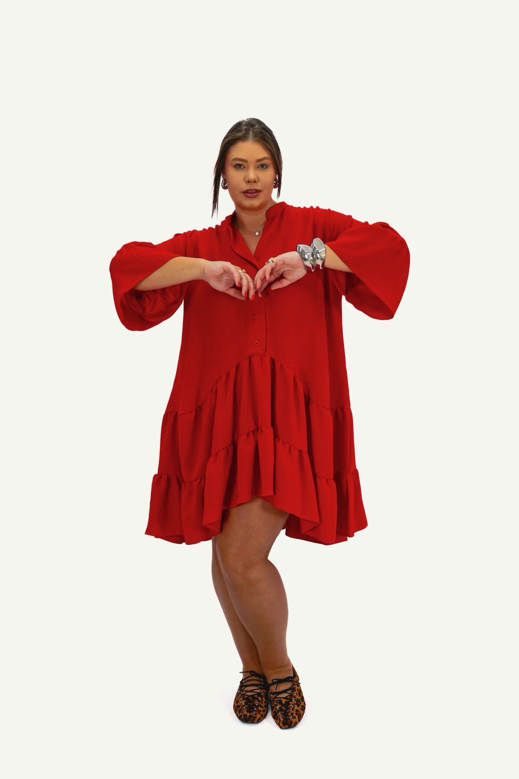 Modelagem: Com modelagem ampla e fluida, as mangas trazem um toque boho-chic e garantem liberdade total de movimento. O fechamento frontal por botões e a gola estruturada conferem um ar sofisticado e permitem que você controle a abertura do decote. O barrado com babado inferior segue o corte mullet, proporcionando um balanço incrível ao caminhar e uma silhueta alongada. O caimento é pensado para valorizar o corpo sem marcar excessivamente, garantindo conforto para o dia todo.