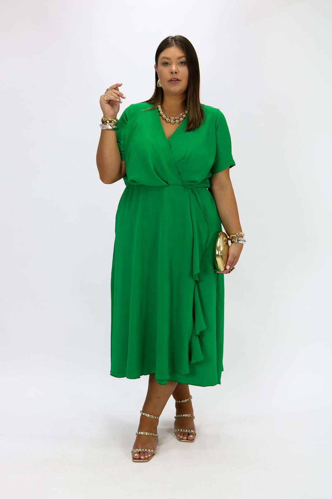Modelagem: Vestido em air flow, de manga curta, elástico na cintura, decote transpassado e com detalhe de babado na fenda frontal.